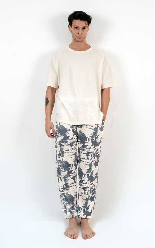 Ribbed patterned pants with a thin drawcord waistband, elasticated cuffs, side pockets, and one back pocket. Made with organic cotton and a touch of elastane for comfort.
