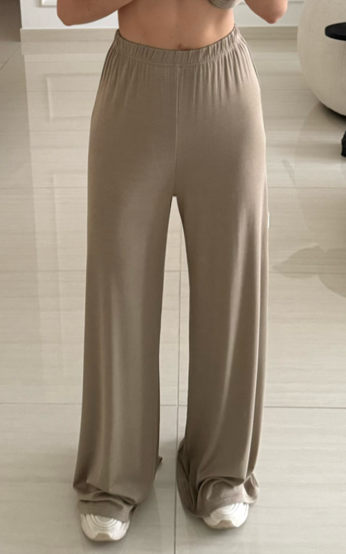 Wide leg pant featuring a thin elasticated waistband. The fabric contains organic cotton and elastane.