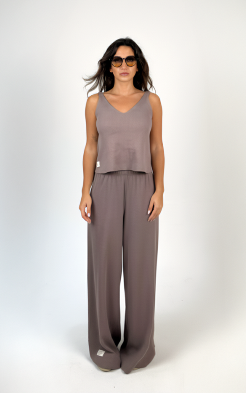 Brown ribbed pants featuring a thin elastic waistband and wide-leg silhouette for a relaxed yet refined look. The fabric contains organic cotton and elastane.