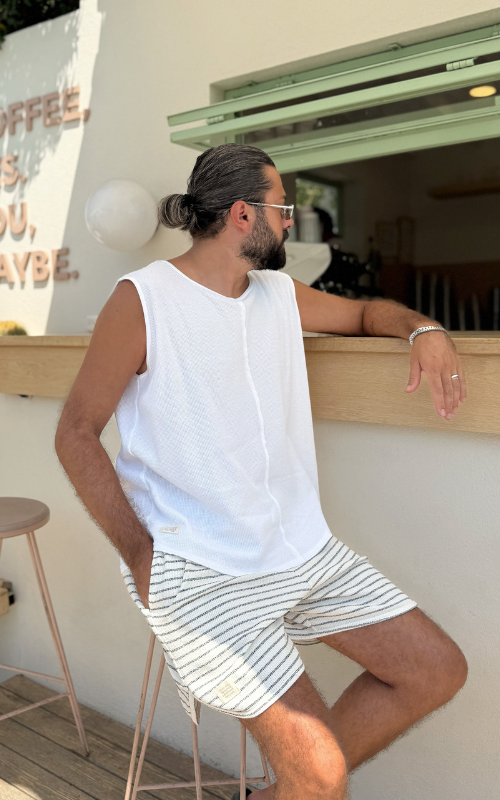 Sleeveless tank with a round neckline and breathable fabric. Features unfinished hemline details at center front and back, with a slightly rounded hem. Made with organic cotton and a touch of elastane for comfort.