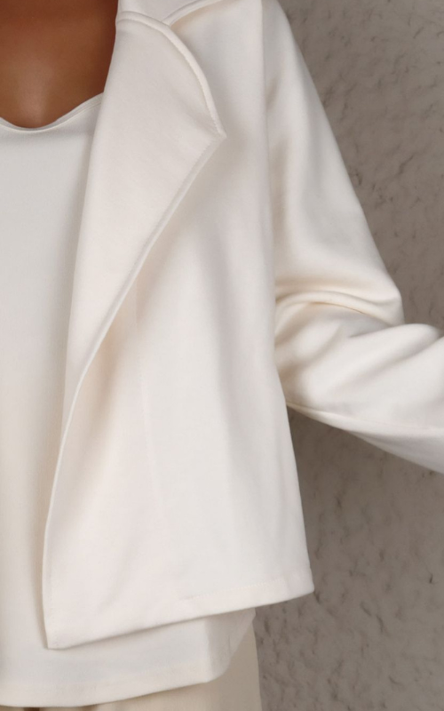 Hip-length jacket with a structured lapel, tailored like a suit blazer, crafted in soft jersey fabric. The fabric contains organic cotton and elastane.