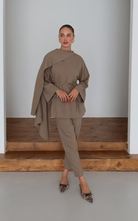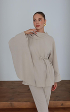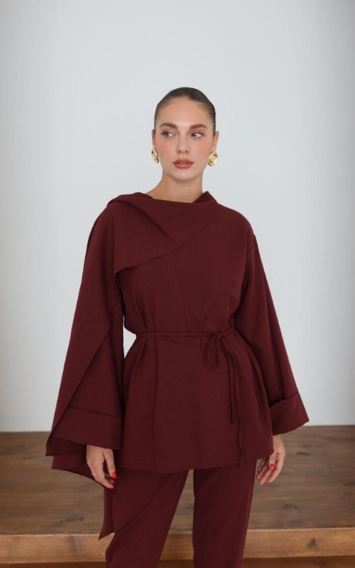 Two piece set featuring a long sleeve top with cuffed sleeves and tie belt detail to cinch in the waist. The top comes with an attached cape that drapes elegantly. Paired with semi fitted, ankle length pants.
