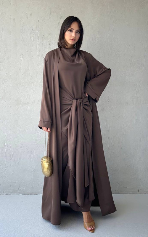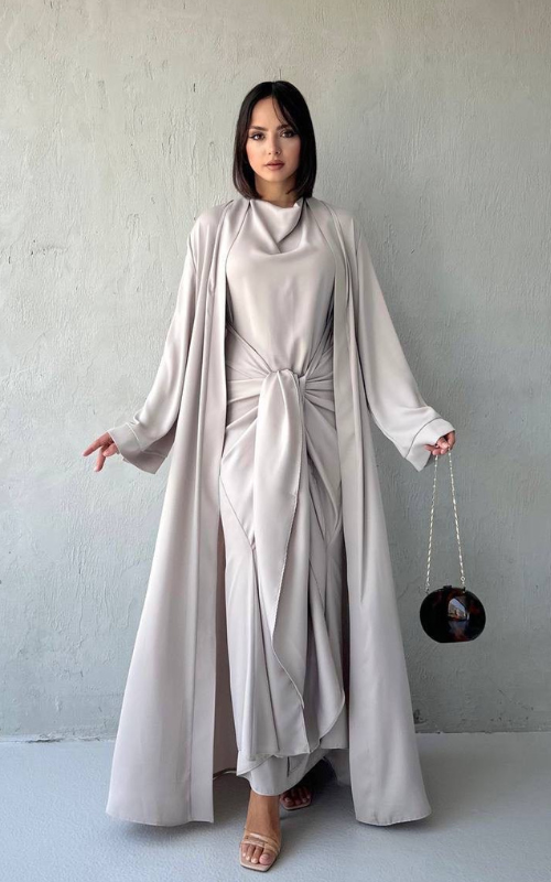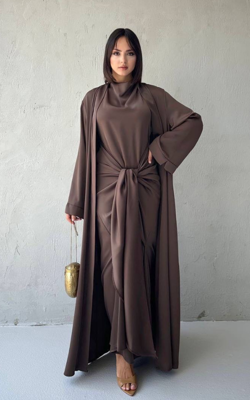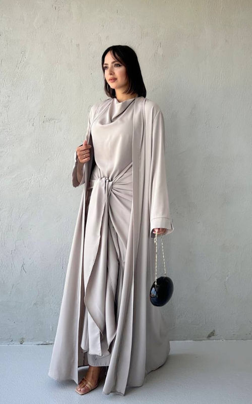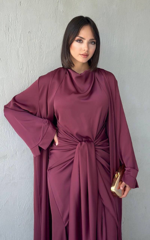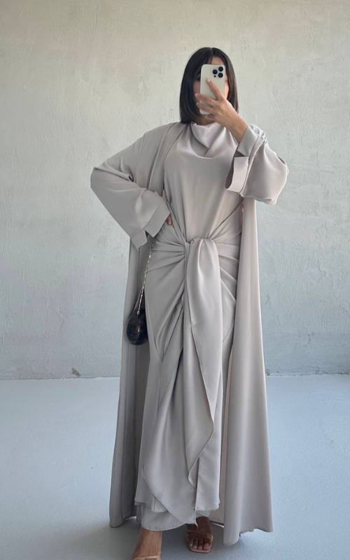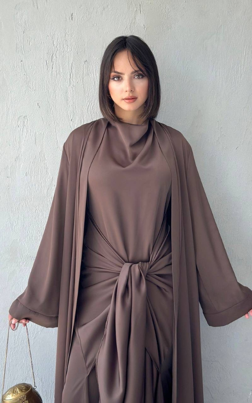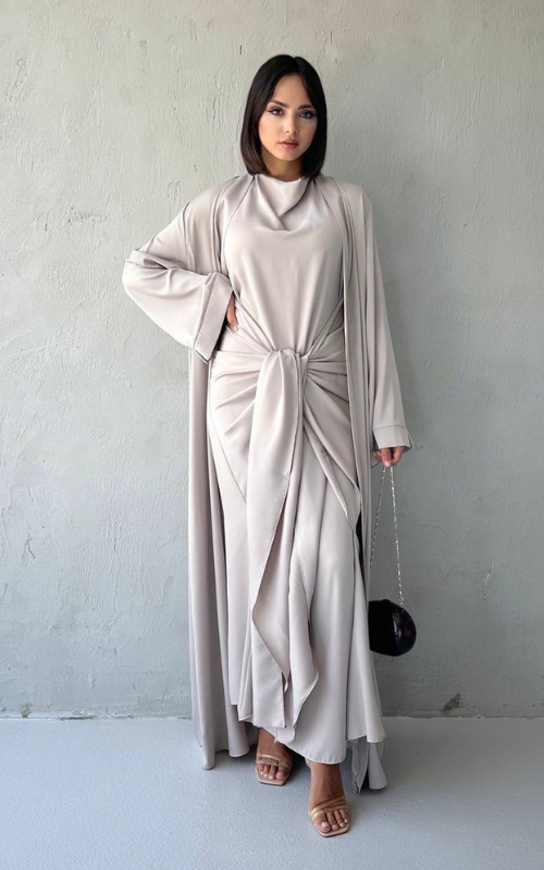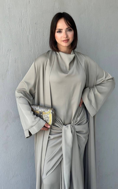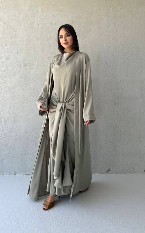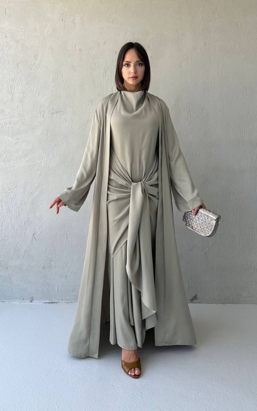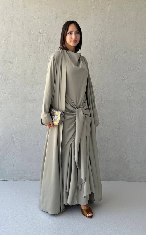 The Celeste Set is a two-piece set featuring a classic draped dress with a front knot detail, paired with a matching flowy open abaya. Perfect for refined, modest occasions.