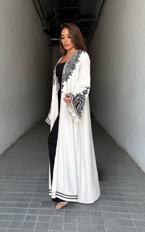The Coco Cardigan is a graceful cream-toned open-front cardigan featuring bold black embroidery in swirling patterns along the neckline,cuffs, and sleeves.