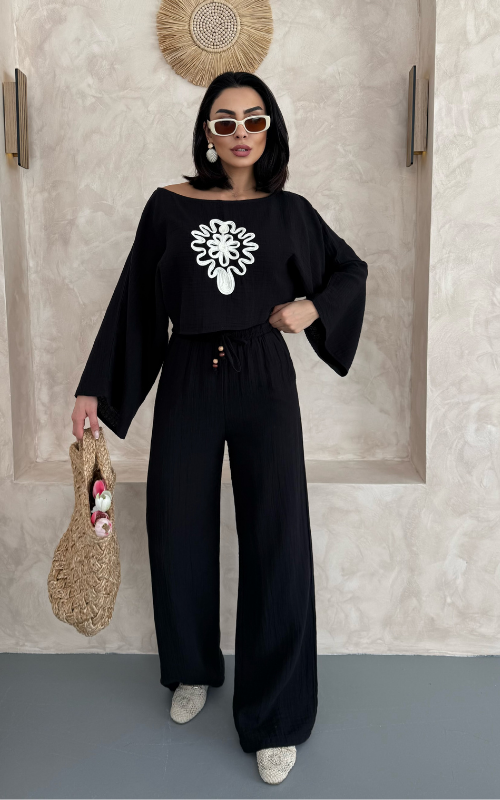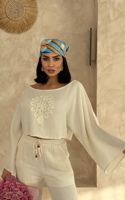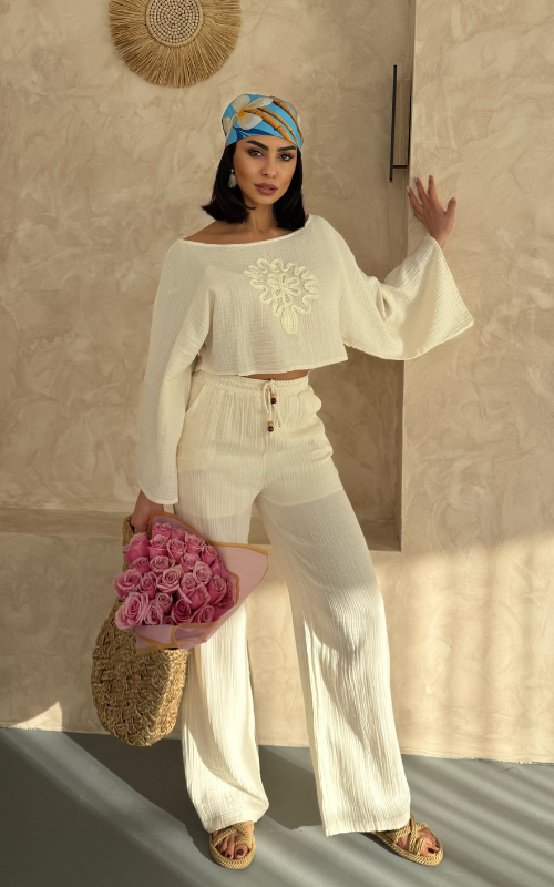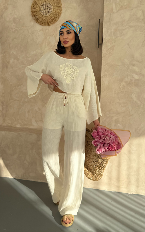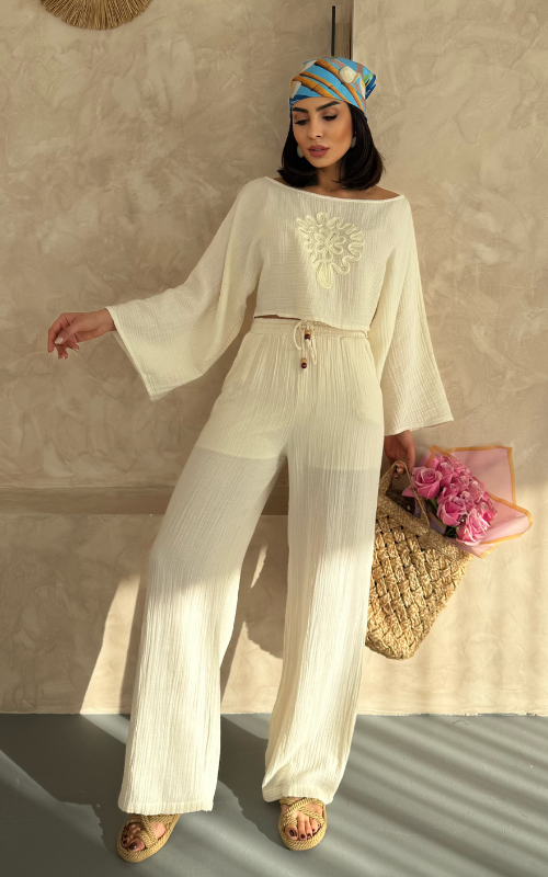 Experience comfort and style with our Darla Set, featuring a boat neckline top with asymmetry and delicate front embroidered motifs, paired with straight-cut pants with a wooden bead-detailed drawstring waist.