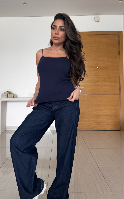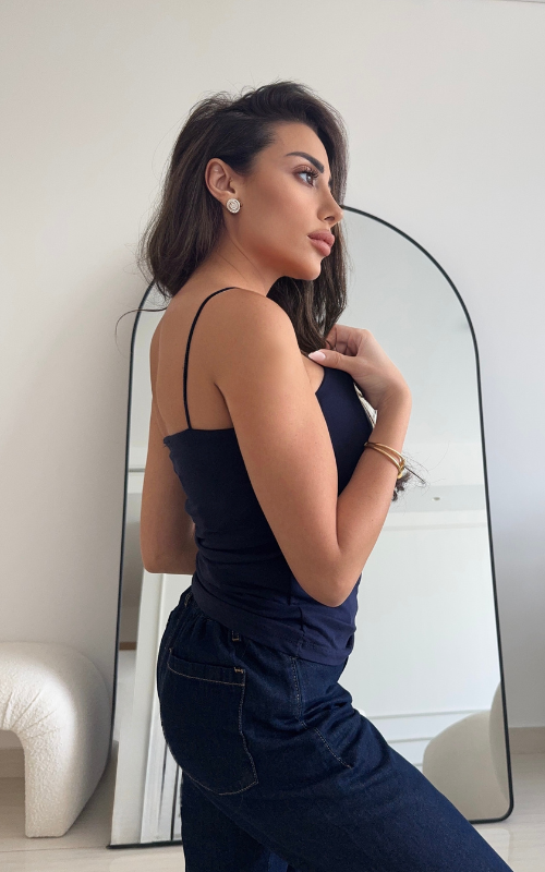 Our Essential Top features an elastic strap camisole made from a cotton-rich fabric with elastane for added stretch, perfect for layering or wearing on its own for effortless style and comfort.