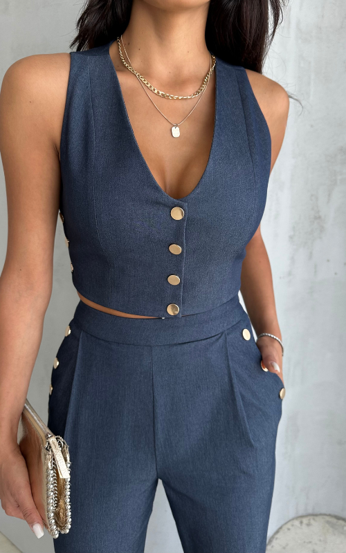 The Gold-Trim Denim Vest is a stylish and versatile sleeveless garment made from high-quality denim, featuring gold buttons on the side for added elegance.