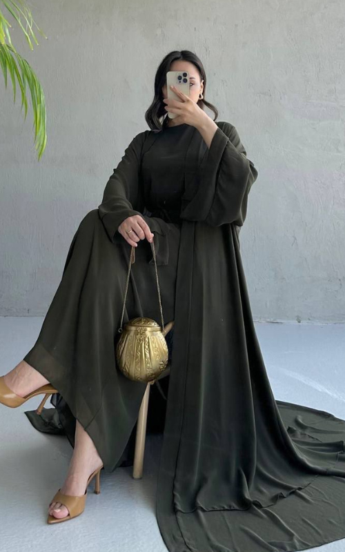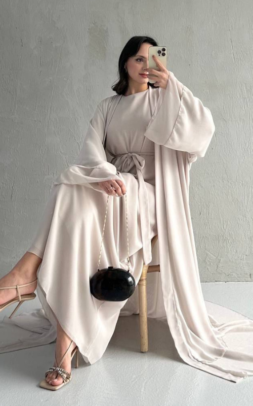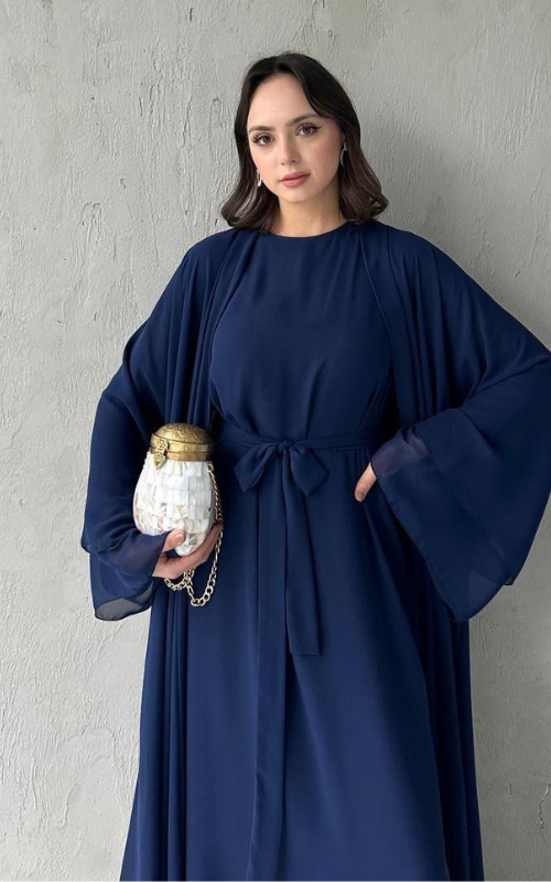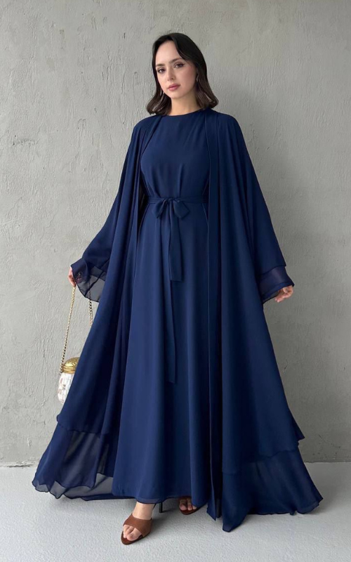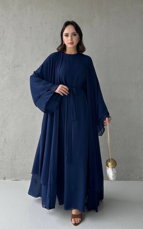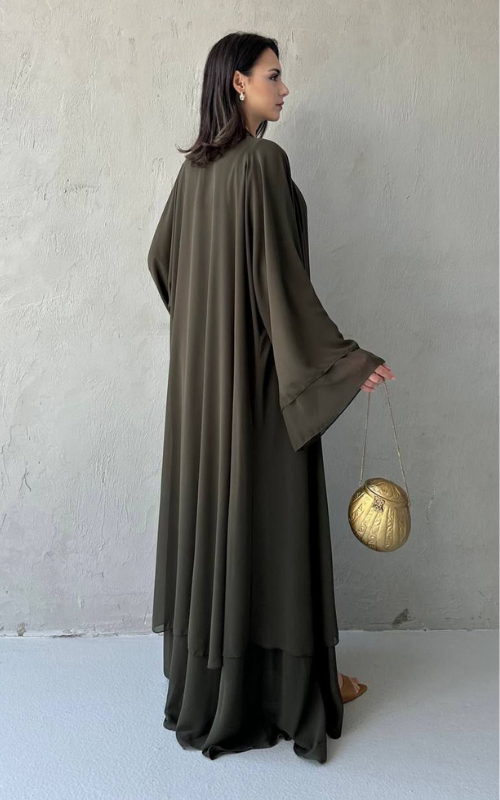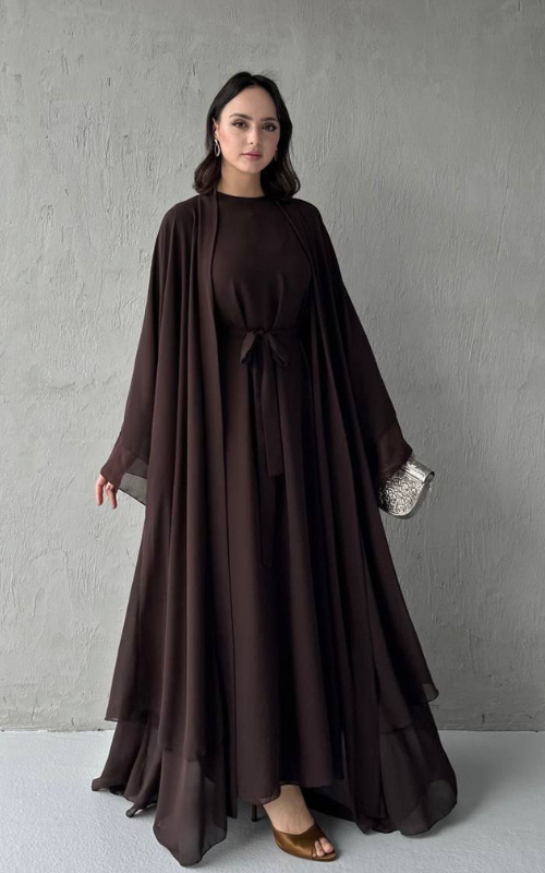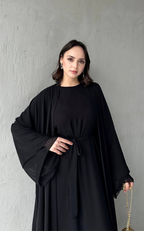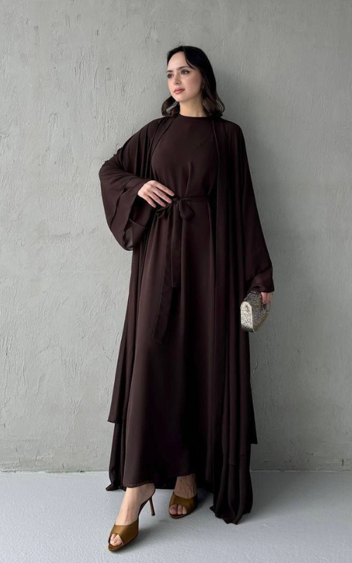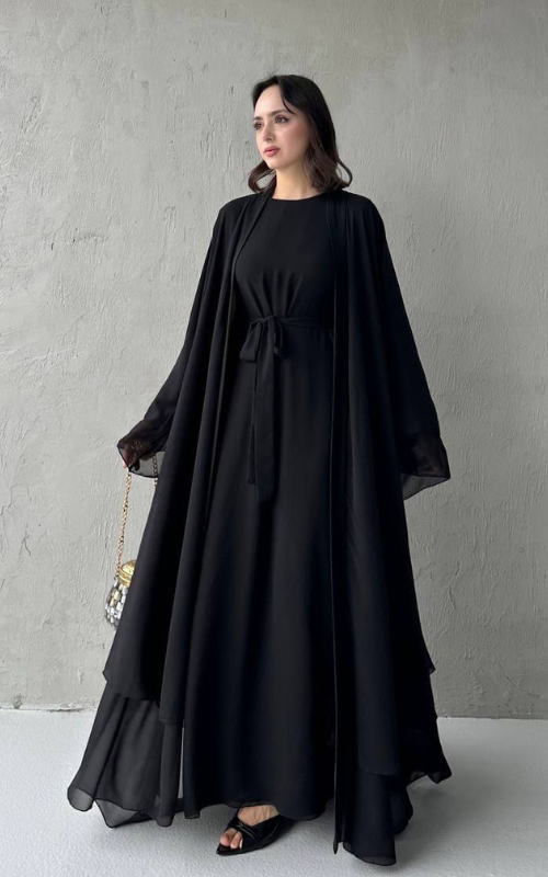 The Haniya Set features a flowy A-line dress with a waist tie, paired with a matching layered, open-front abaya with layered hems and wide sleeves that create beautiful movement.