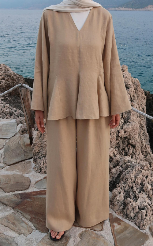 The Layal Top features a deep V-neckline, wide and flowing long sleeves and slightly flared hemline, giving it a soft A-line shape. The drawstring tie detail allows for an adjustable fit.