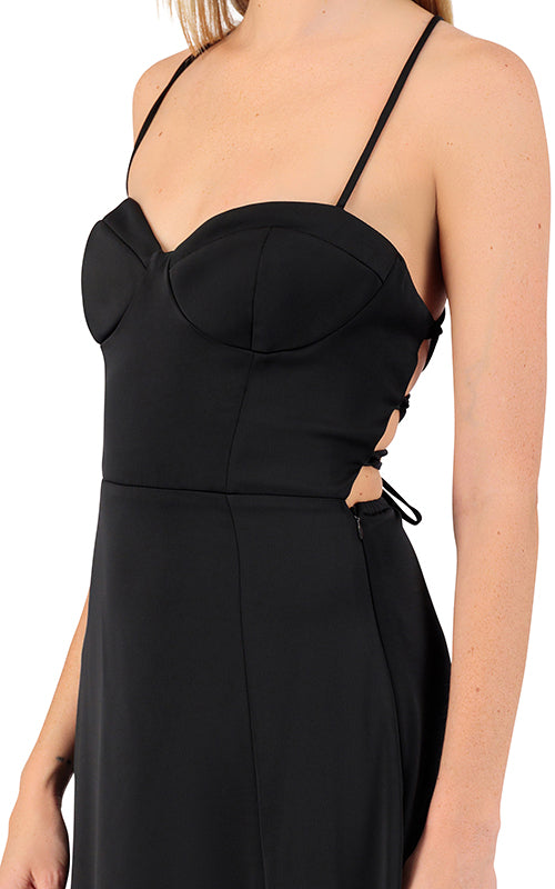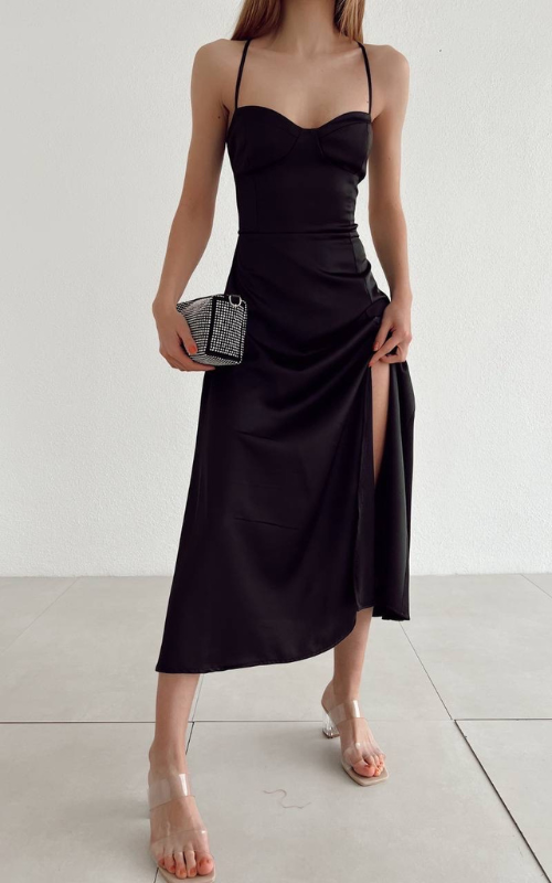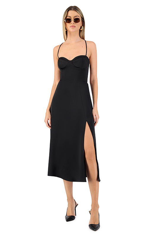The Romantic Spot Dress is ultra-flattering with its sweetheart neck, bustier-inspired bodice and a thigh-high slit at front.