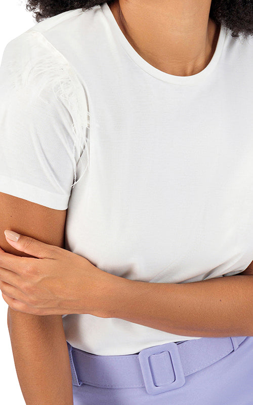 If you’re a lady who likes minimal fashion with just enough charm, then you’ve landed on the right page! The Feather-Embellished T-Shirt showcases a simple style that’s complemented with feather trims at the shoulders to sweeten the look, framed with a crew neck and airy short sleeves.