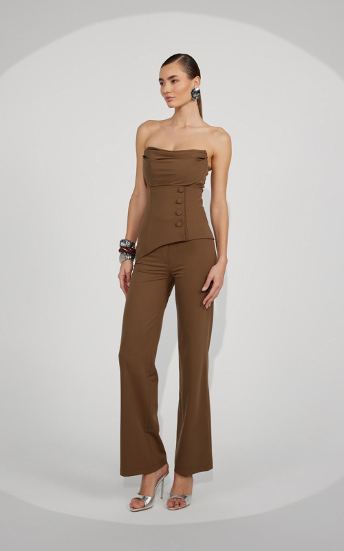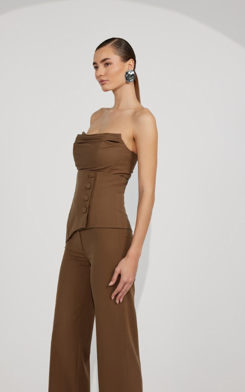 A two-piece top features a corset-inspired upper with contour seams. The matching high-waisted panel adds definition at the waist, complete with button detailing in the front and a back zip closure.