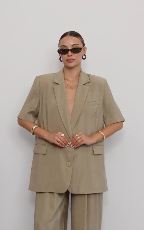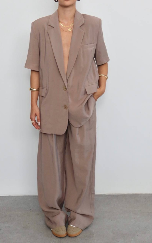 Relaxed suit set featuring a short-sleeve oversized blazer and wide-leg trousers, creating an effortless yet refined look.
