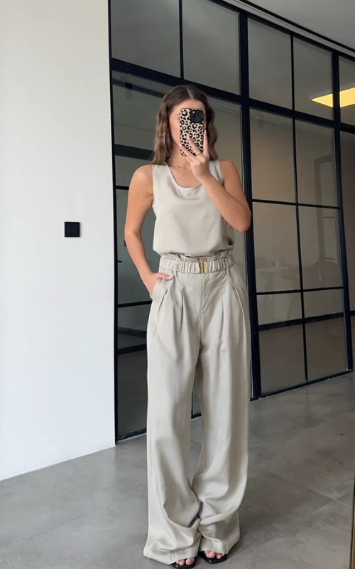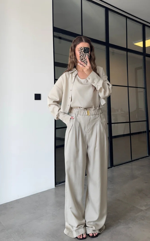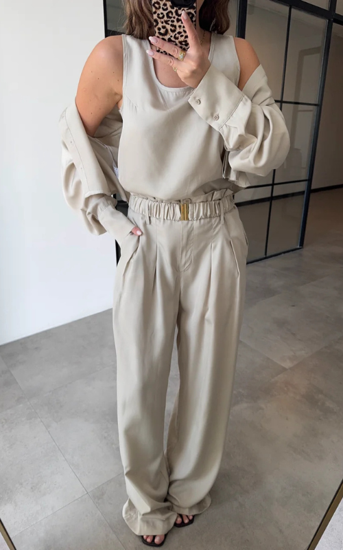 The Aysel Set is a stylish 3-piece ensemble featuring a sleeveless top, a long-sleeved blouse, and high-waisted palazzo bottoms with a ruched gartered belt—perfect for an effortlessly chic and coordinated look.