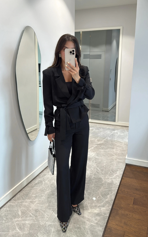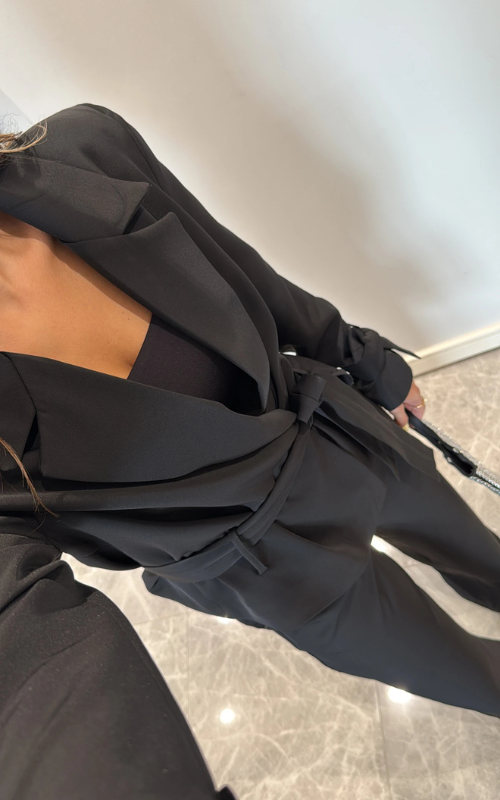 The Elena Set features a structured blazer with padded shoulders, waist and wrist belts for a tailored fit, paired with straight-cut pants complete with pockets—delivering a polished and powerful look.