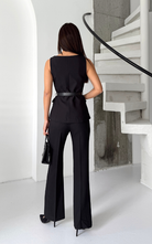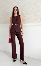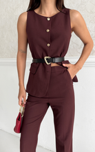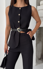 Classy set featuring a buttoned vest adorned with gold buttons and belt to enhance the waist. Paired with a slightly flared hem, high waisted pant.