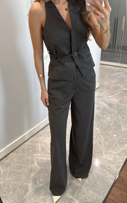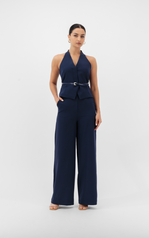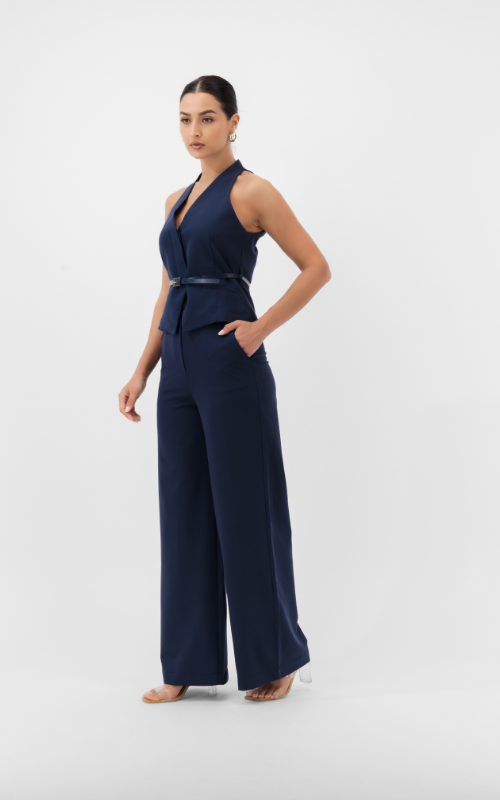 A tailored sleeveless set, featuring a V-neckline and structured waist detailing with a sleek belt accent. Paired with wide-leg trousers, it offers a sophisticated yet modern silhouette—perfect for polished workwear or elevated casual looks.