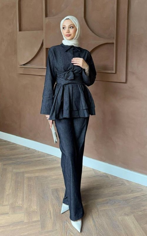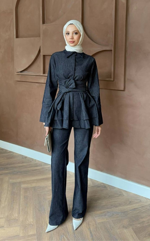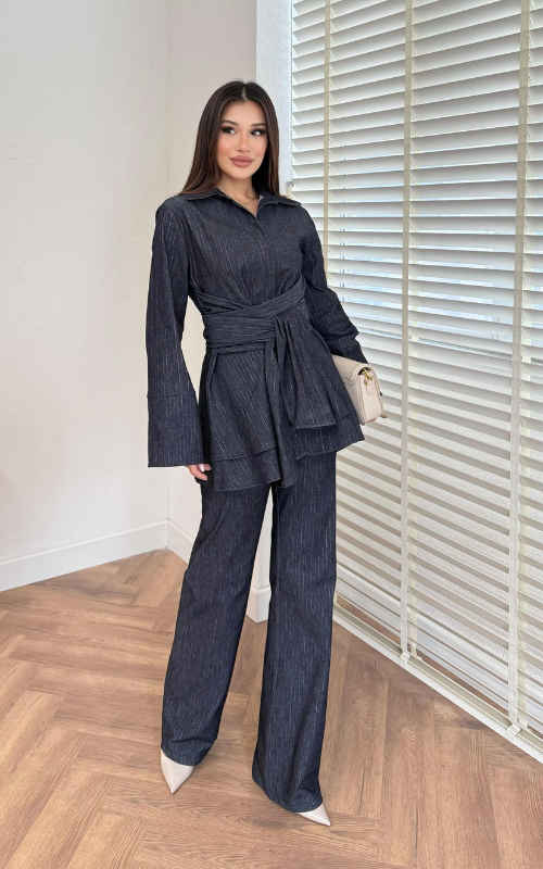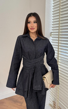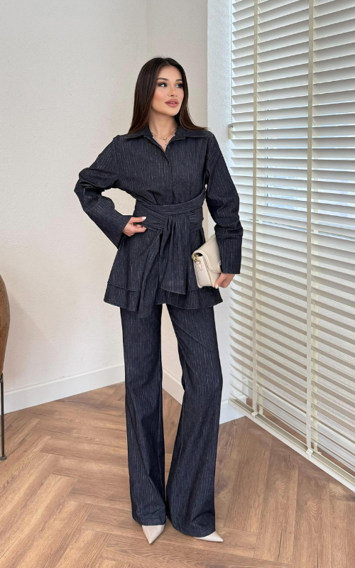 Set crafted in denim featuring a hip length, long-sleeve top with a collar and tie belt detail to enhance the flared hemline. Paired with a high waisted pant with a delicate bell bottom.