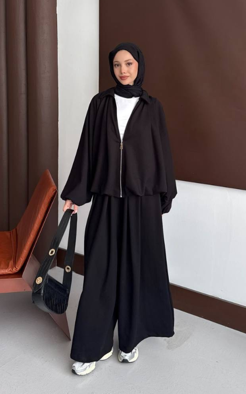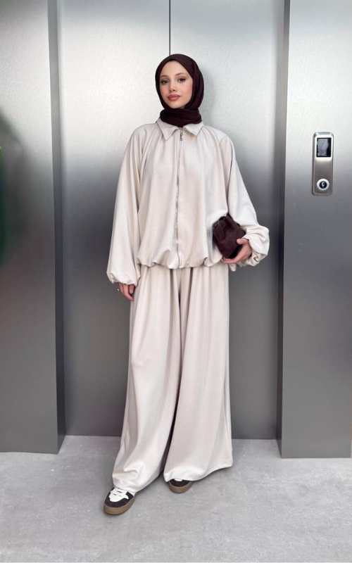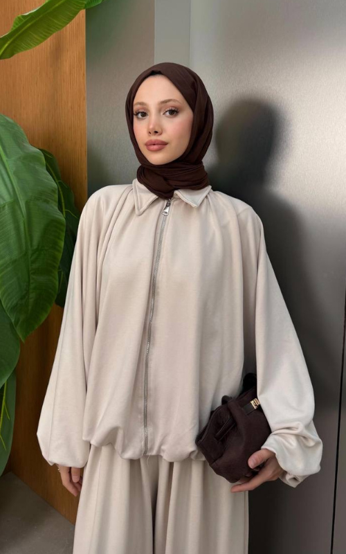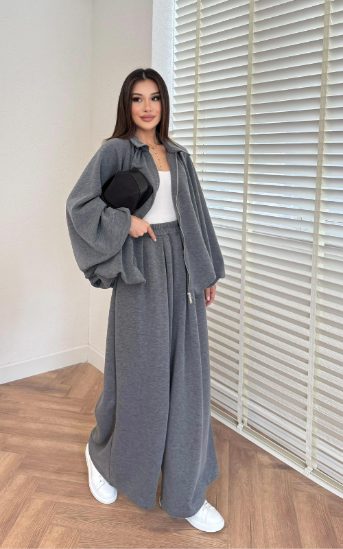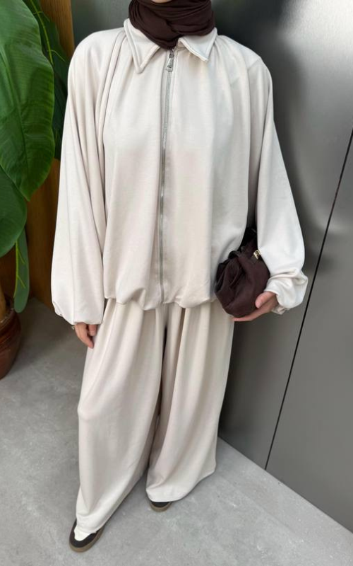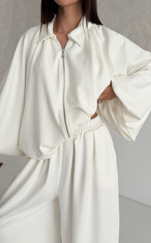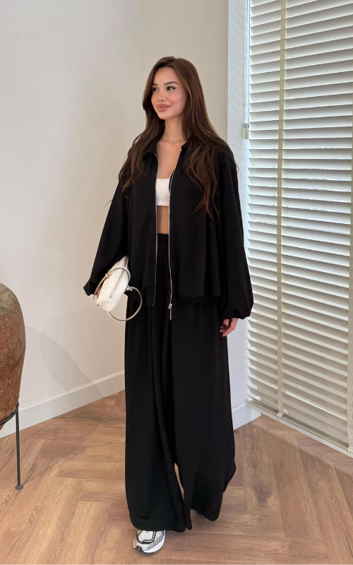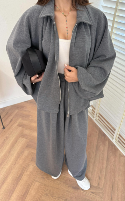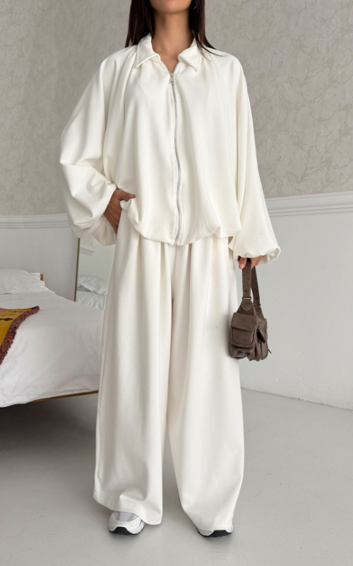Oversized set crafted in jersey fabric featuring a zip-up jacket with a collar and gathered hem and cuffs for a puffy look. Pants are wide leg and high waisted with an elasticated waistband.