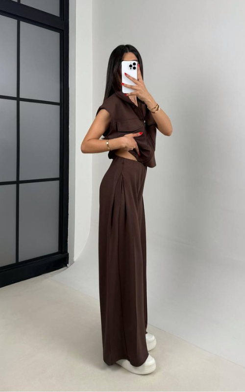 The Myth Set features a zip-up sleeveless top with structured shoulders and flap chest pockets, paired with high-waisted wide-leg trousers. Designed for comfort and effortless elegance.