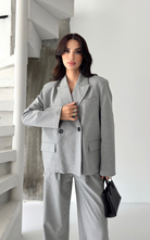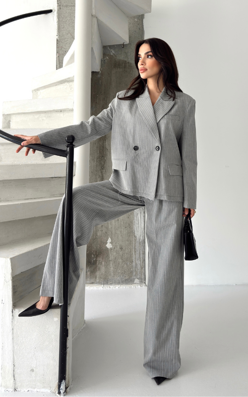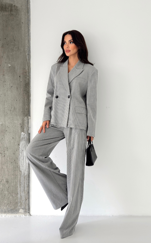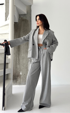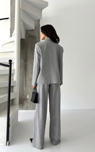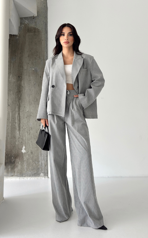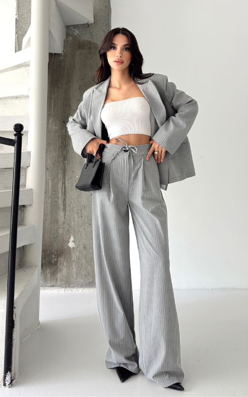Set featuring a loose-fit blazer in pin-stripped fabric. Paired with a matching wide leg pant with a drawstring elasticated waistband.