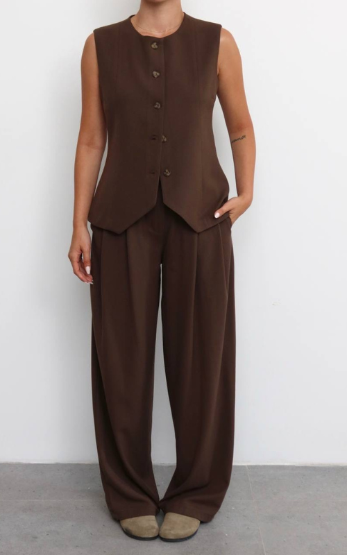 Matching two-piece featuring a chic button-up vest with a round neckline; paired with a flow straight cut, high waisted pant.