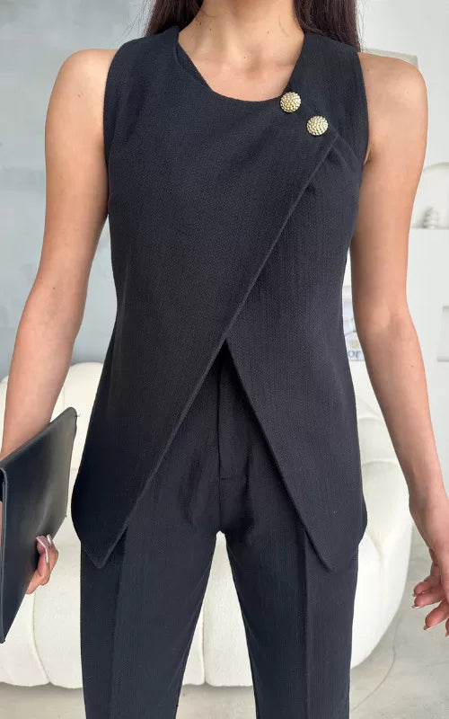 Turns heads with our Gossip Top, with its strategically positioned buttons, assymetrical cut and sleeveless look, it highlights feminine beauty with grace.