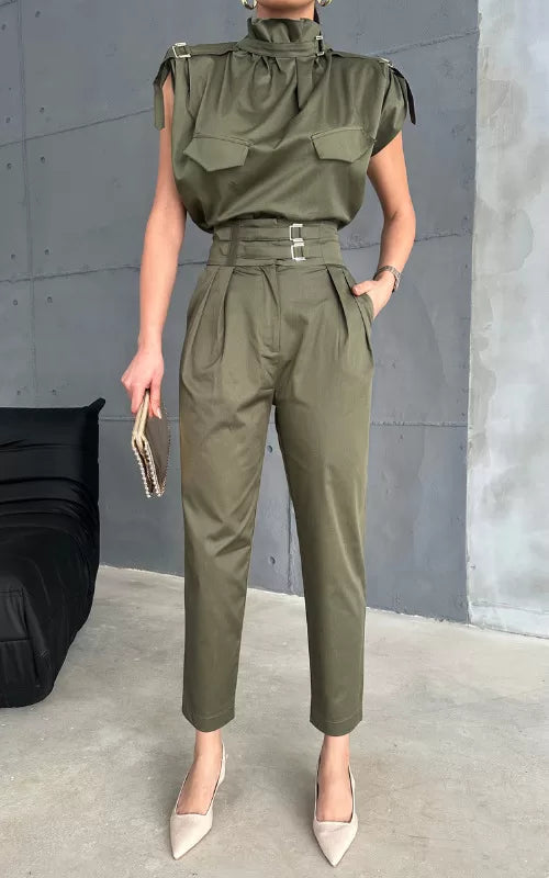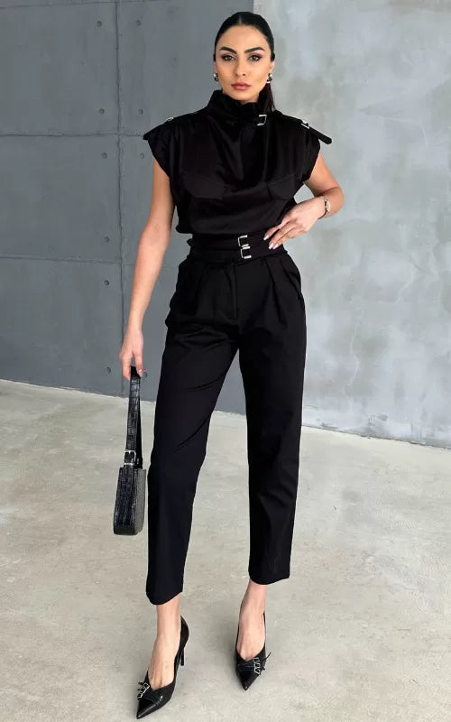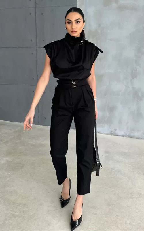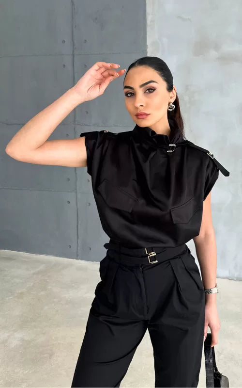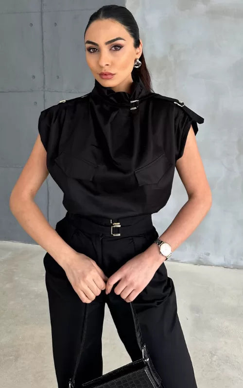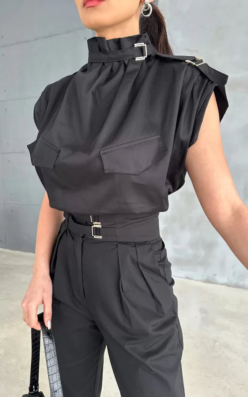 Crafted with precision and adorned with exquisite details, our Ritzy Top features a gathered and buckled turtleneck, chic faux pockets and buckled shoulder detail.