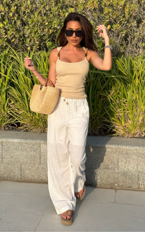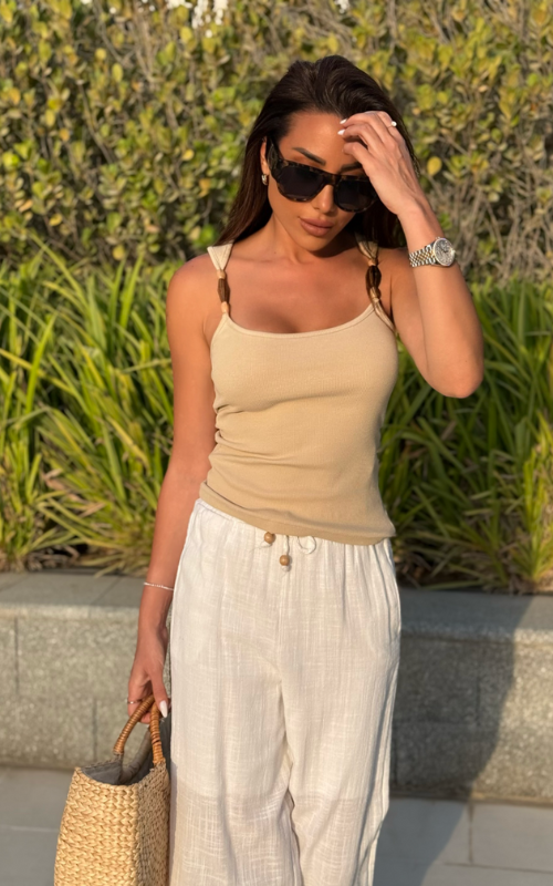 The Club Top is a sleeveless style with a wide round neckline and straps adorned with wooden beads, adding a playful, summery touch to your look.