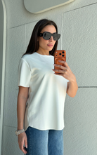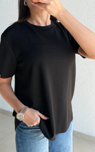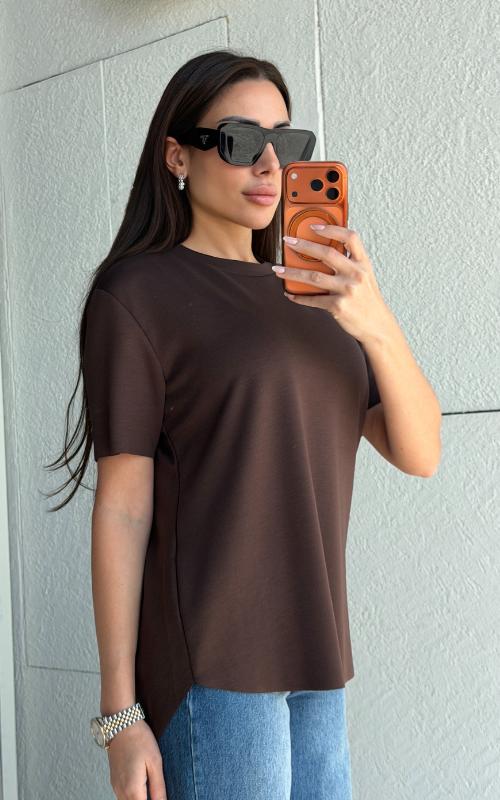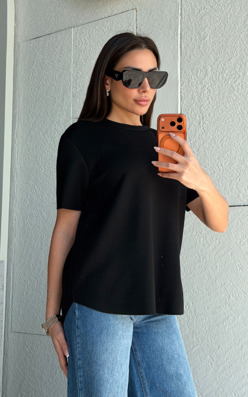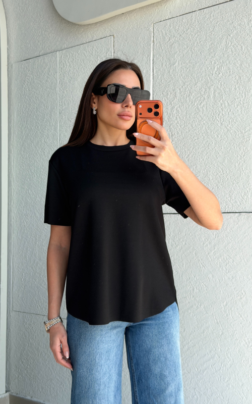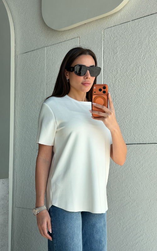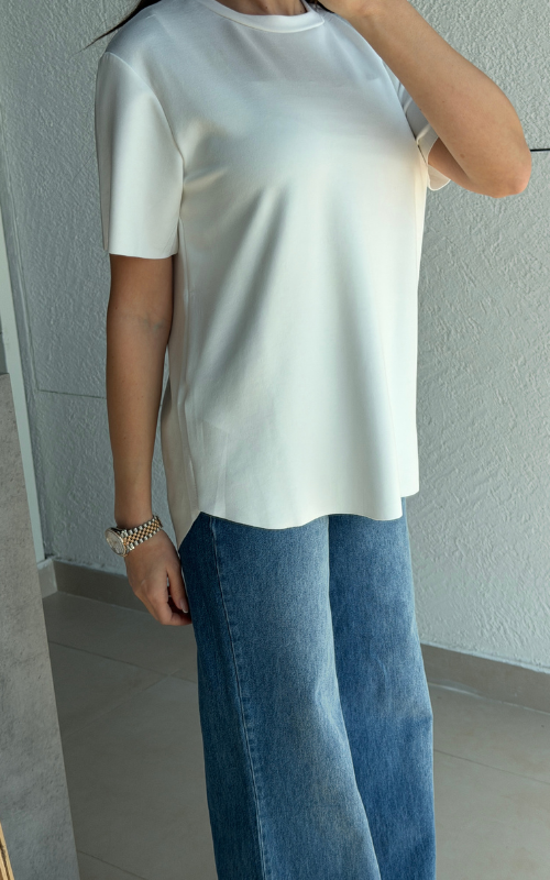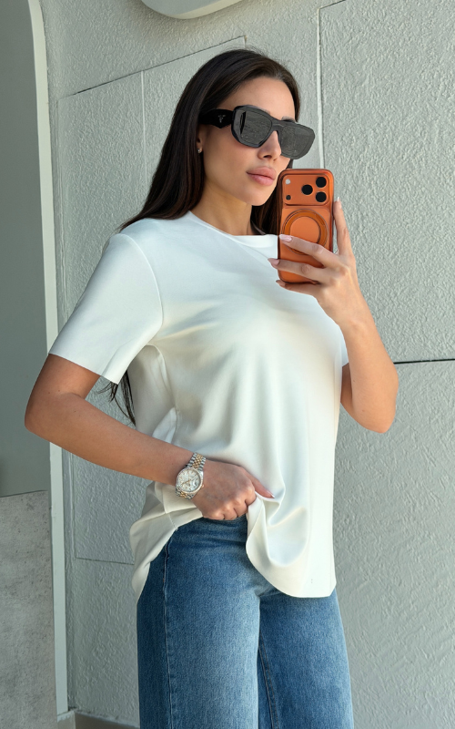 Super lightweight T-shirt with a classic round neckline and a curved high-low hem. Finished with a raw-cut edge that won’t fray for an effortlessly modern look.