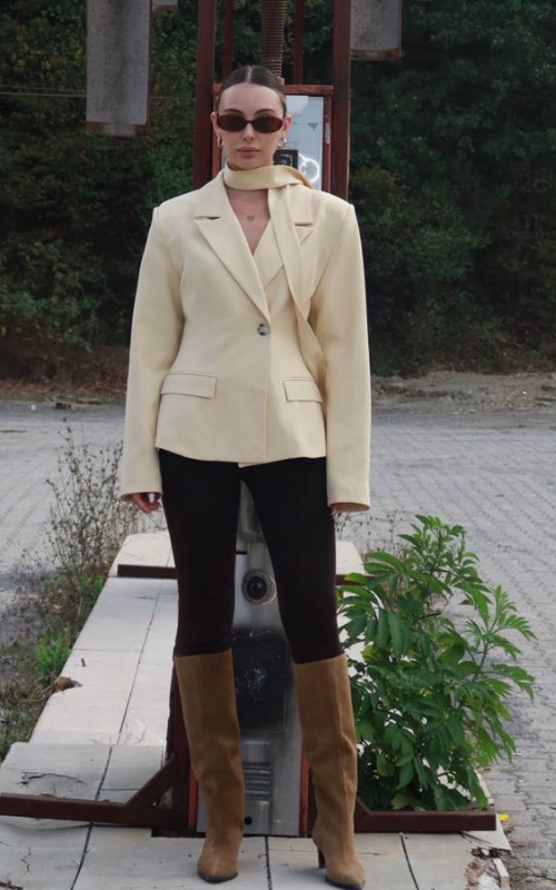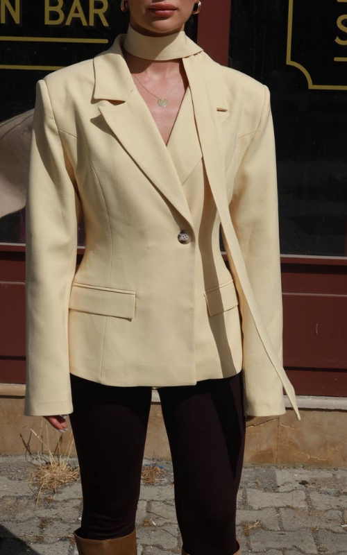 A sharply structured blazer with padded shoulders that accentuate the silhouette and create a cinched waist effect. Designed with a single-button closure, flap pockets, and a coordinating scarf for a refined touch.
