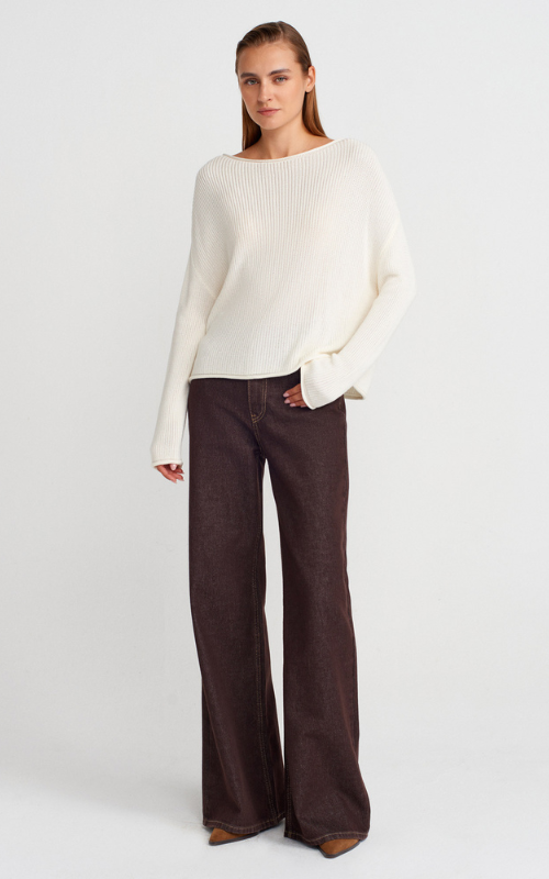 Loose-fit, long sleeve top in knit fabric of medium thickness. The top features a round neckline and straight hemline.