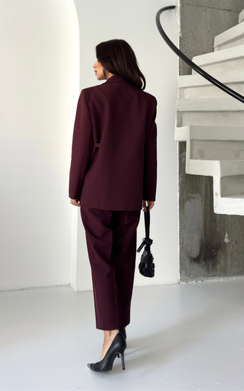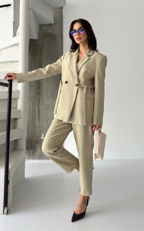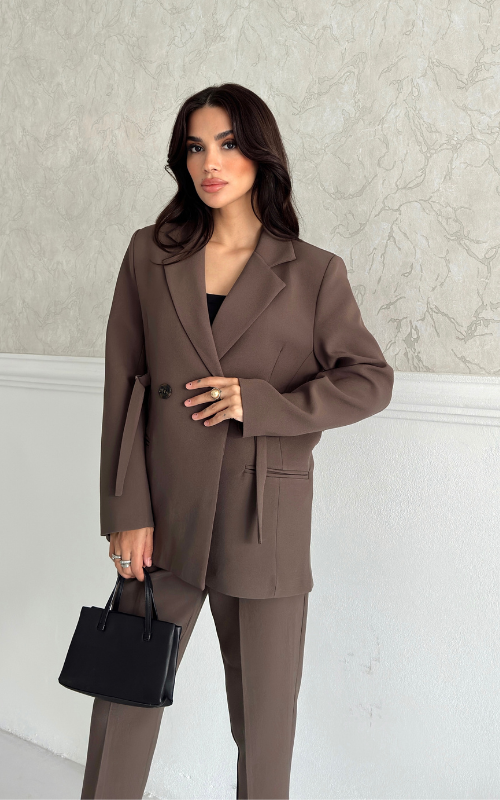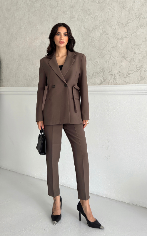 Fitted, well-tailored blazer with two front buttons for closure. Waist can be tightened to your liking through attached belt details on the side for a cinched look.