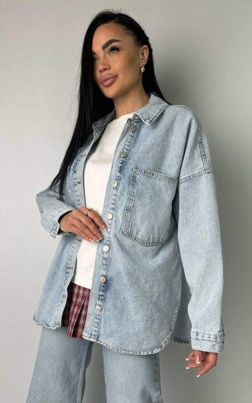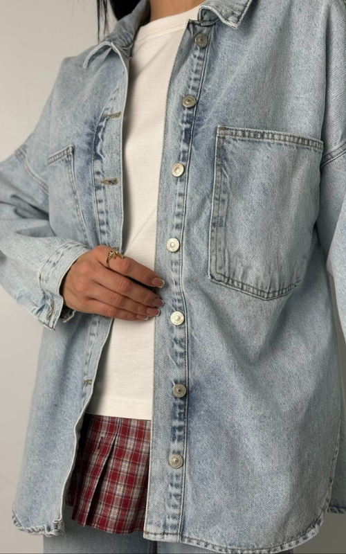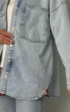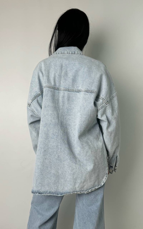 Washed-out denim jacket featuring rounded side slits and two oversized front pockets for a relaxed, effortless look.