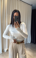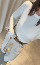 Slightly fitted long sleeve top in thin knit fabric. The top features a round ribbed neckline, buttons on the cuffs as well as a small slit.