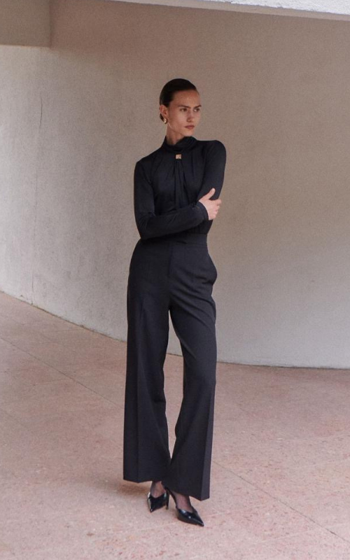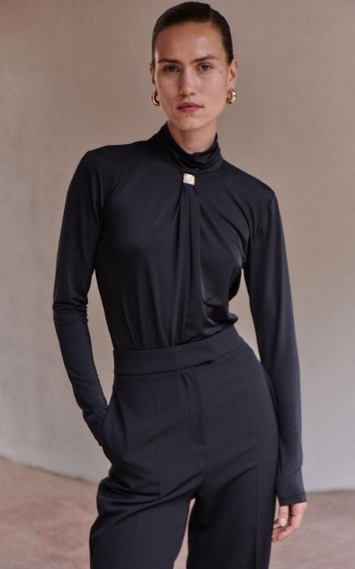 Crafted from figure-hugging elastic fabric, this high-neck, long-sleeve bodysuit stuns with refined gold detailing at the front and a daring open back that contrasts its fully covered silhouette. A bold balance of elegance and allure.