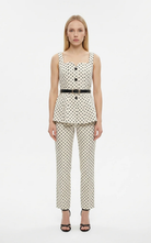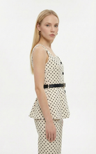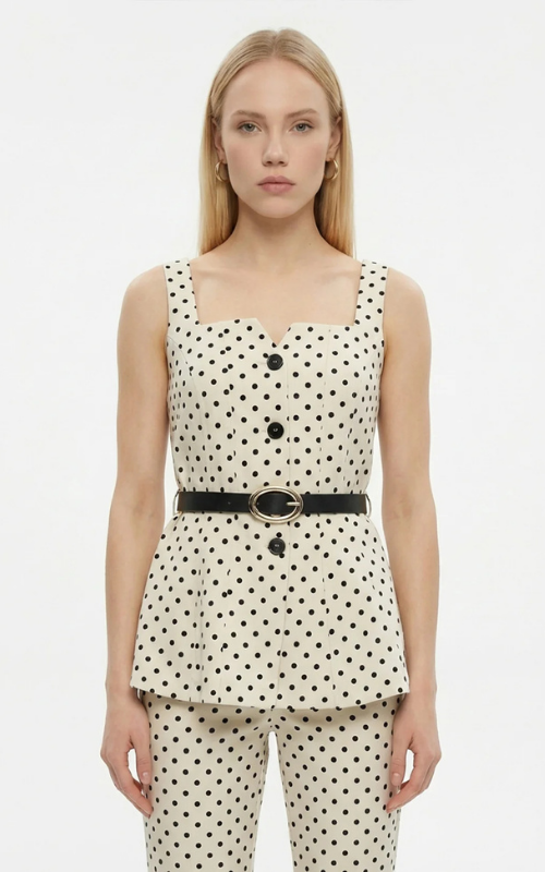 The Polka Vest is a sleeveless tailored vest with playful polka pattern, button front, defined waist, and detachable belt for a refined, flattering silhouette.