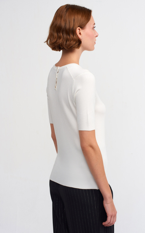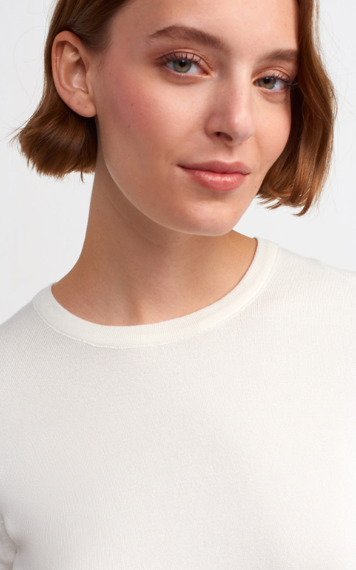 Classic knit t-shirt featuring a round neckline and short sleeves that reach slightly above the elbow.