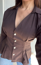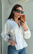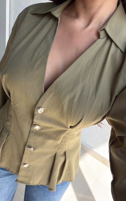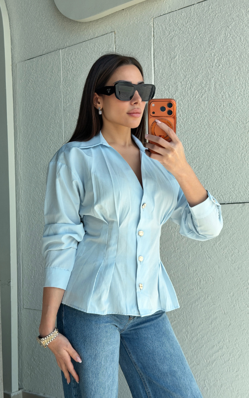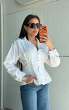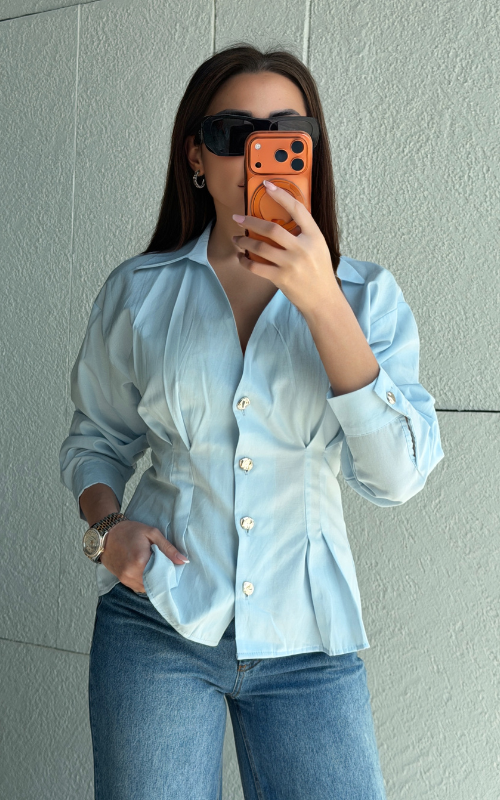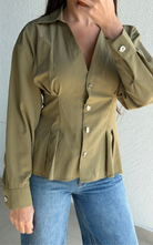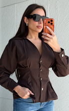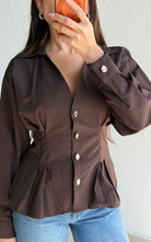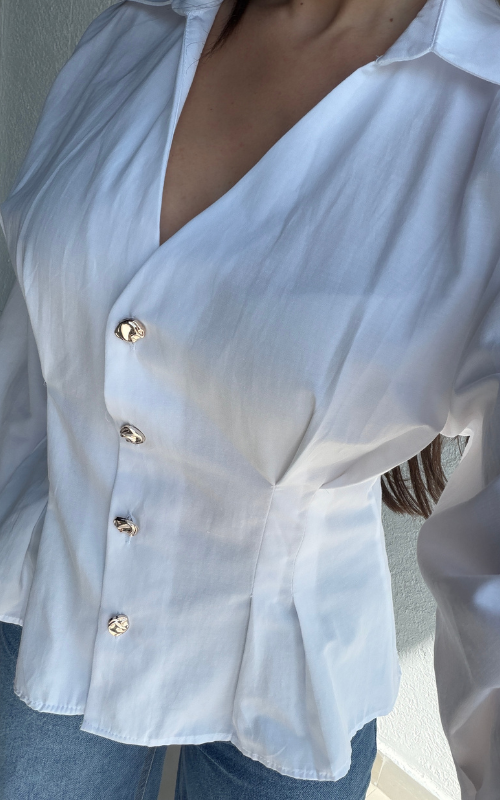 Tailored button-front blouse featuring a sharp collar and structured silhouette. Designed with statement buttons and shaping at the waist.