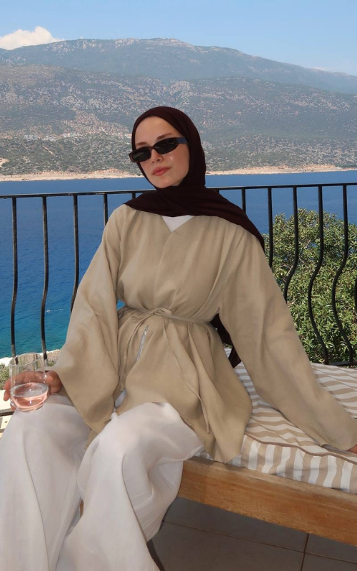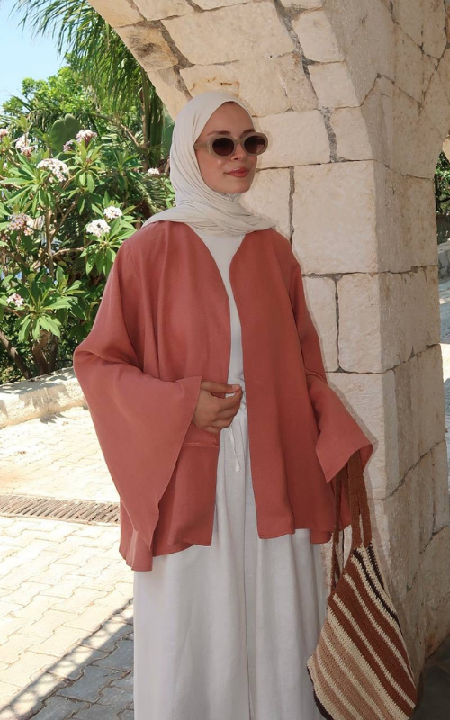 The Samar Cardigan is a kimono-inspired blouse with a relaxed silhouette, featuring a soft open front that can be cinched at the waist with a tie belt. It has a wide, draped sleeves and flared hemline.