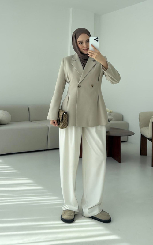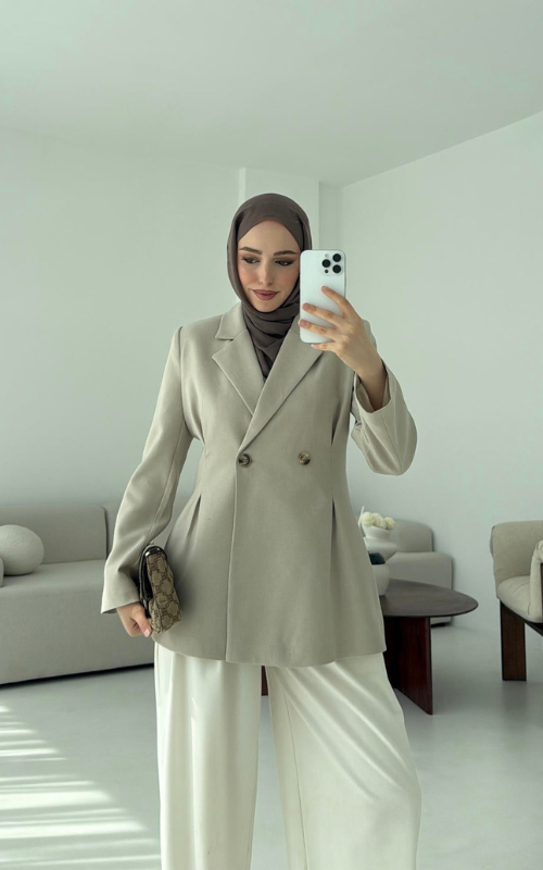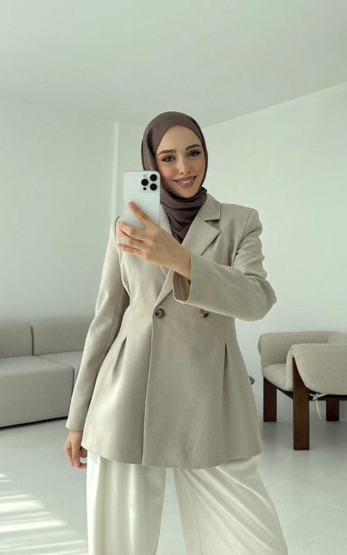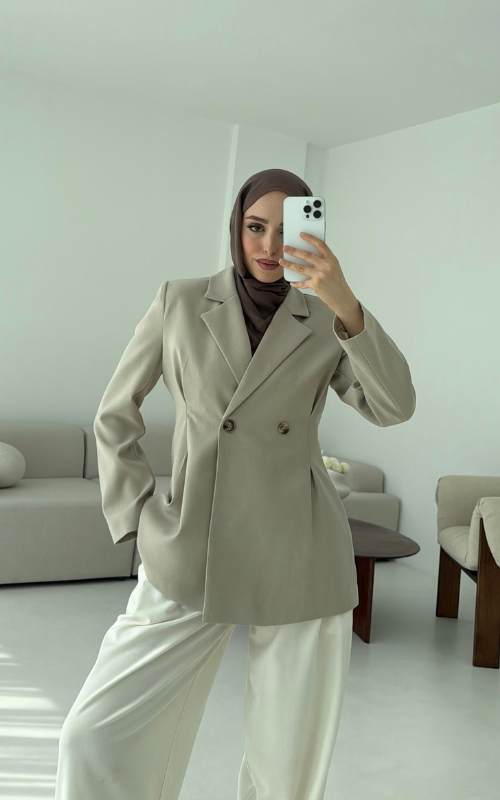 Double breasted blazer with darts closed along the waist that flare, creating a tailored silhouette.