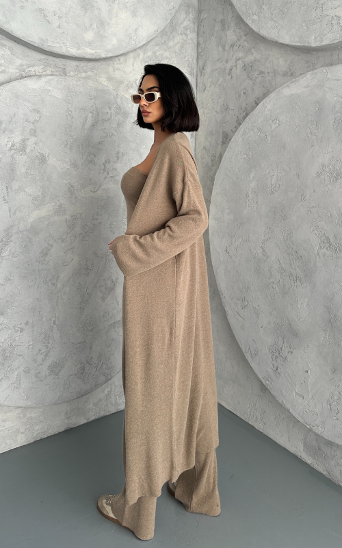 Elevate your look with our Pinterest Set, featuring a strapless top, comfy knit pants, and a long cardigan. Perfect for any occasion, this versatile ensemble offers endless styling options!