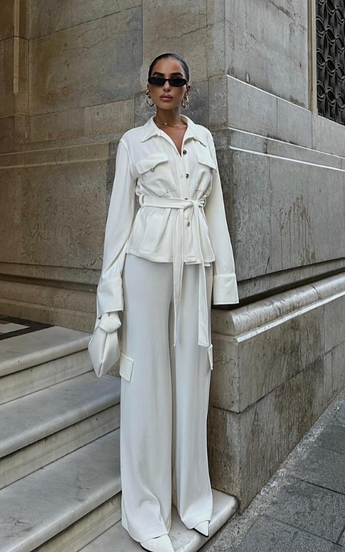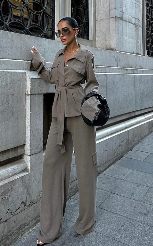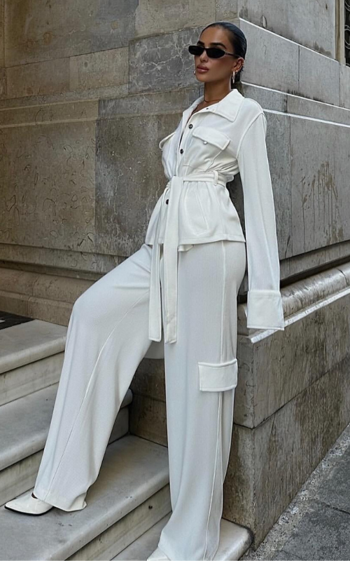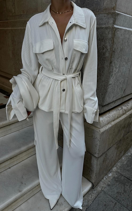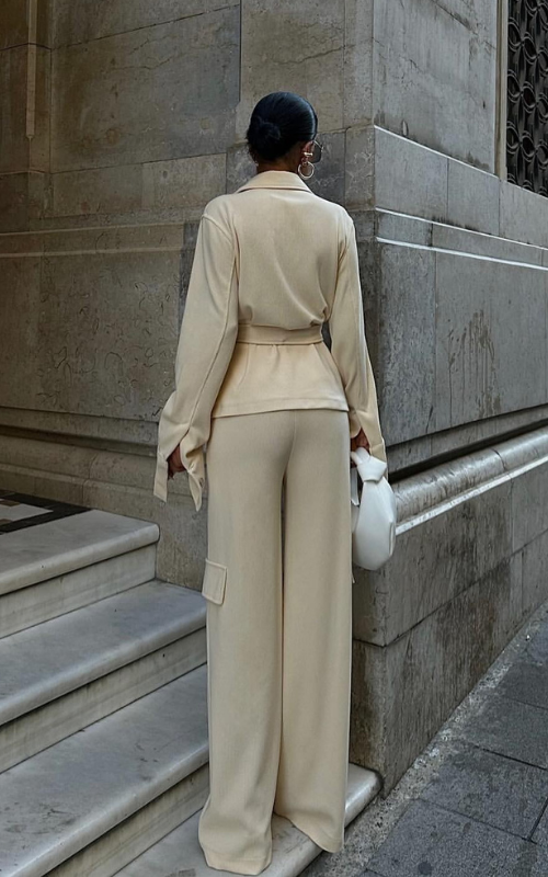 Showcase your elegance with The Darling Set, featuring a tailored top with adjustable tie for a custom fit that flatters every form while the matching bottoms are adorned with faux pockets.
