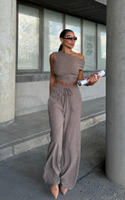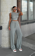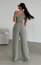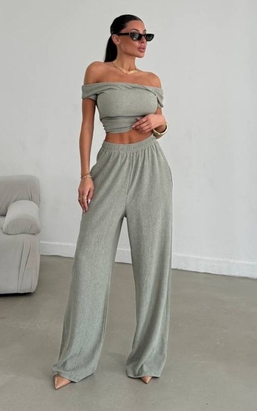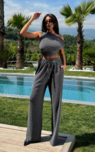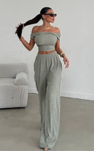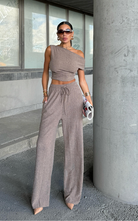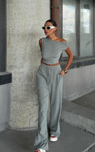 Our Adore Set features a one-shoulder ruched crop top paired with a drawstring waist pants. The top's ruched detailing adds a touch of sophistication, while the pants ensure an easy wear.