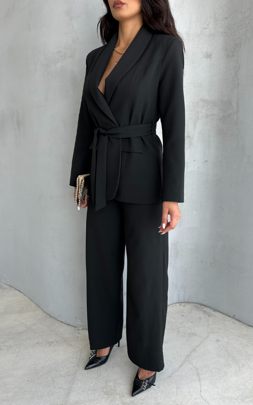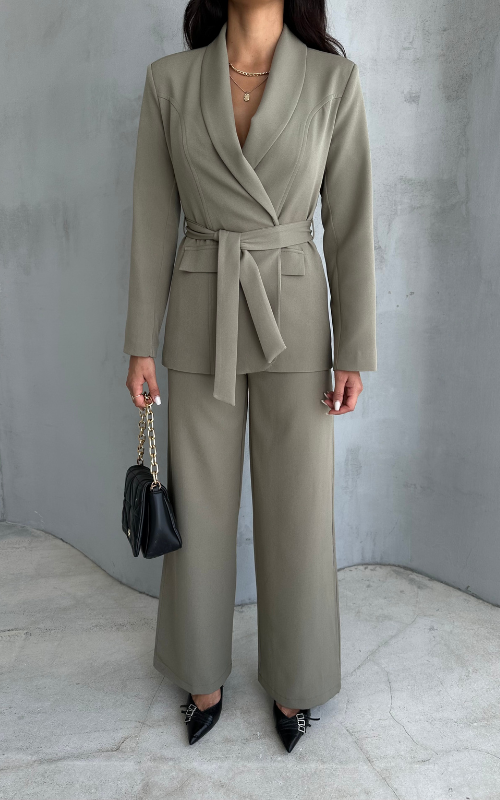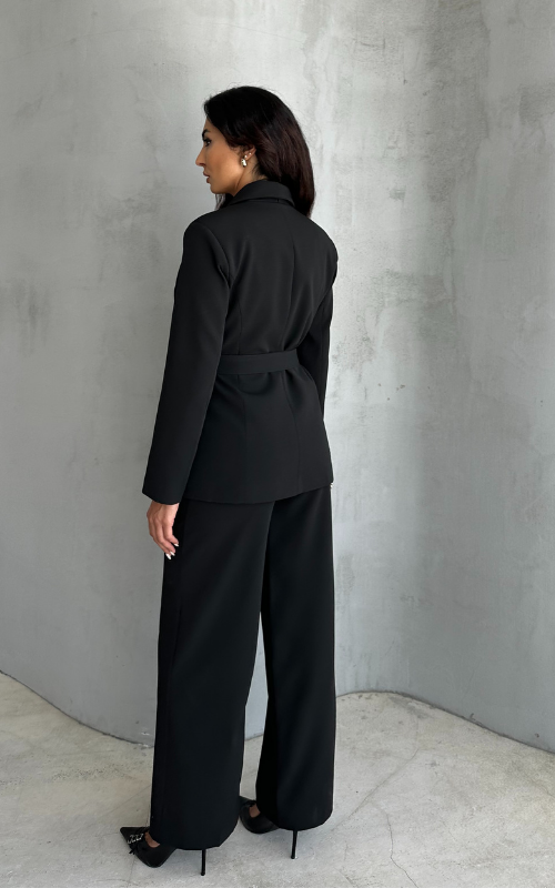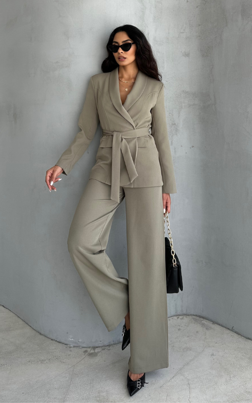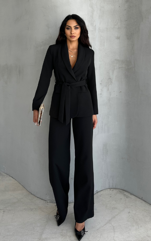 A coordinated outfit featuring a tailored blazer and matching trousers, perfect for both professional, formal occasions.