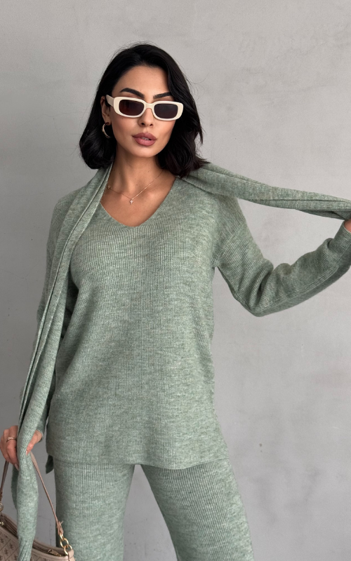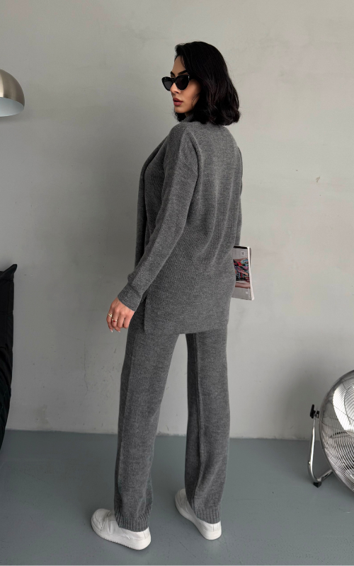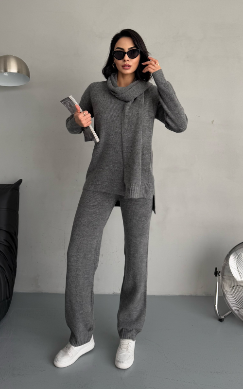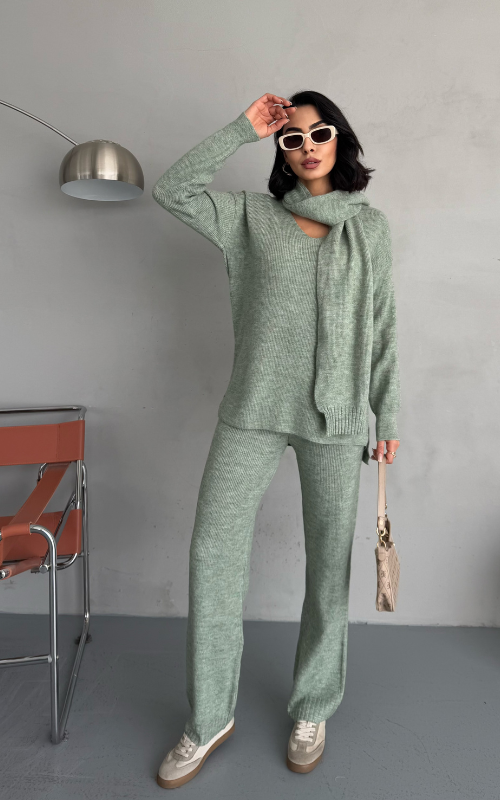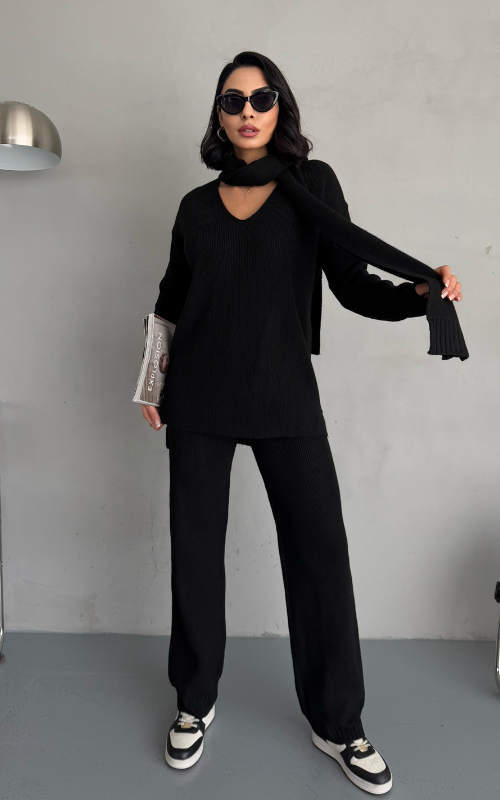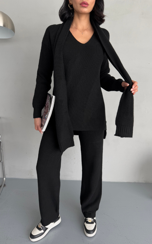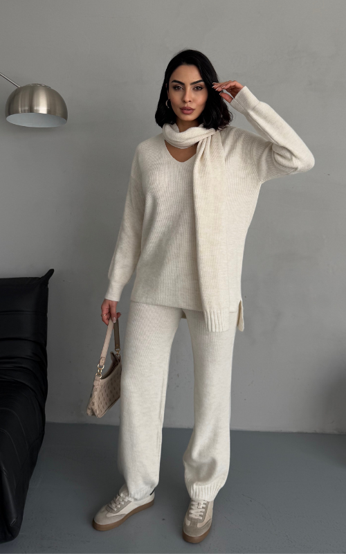 Stay warm and stylish with Alexa Set, a winter knit coord set that features straight-cut pants for a polished look, a cozy and relaxed-fit top, and a matching scarf to complete the ensemble.