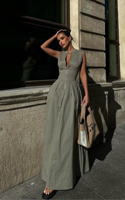 Our Alina Dress is a sleeveless maxi dress featuring a flattering round neckline, a front zipper closure, and side pockets. it's perfect for casual outings or relaxed evenings.
