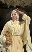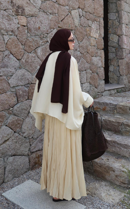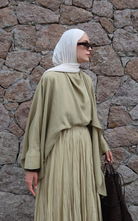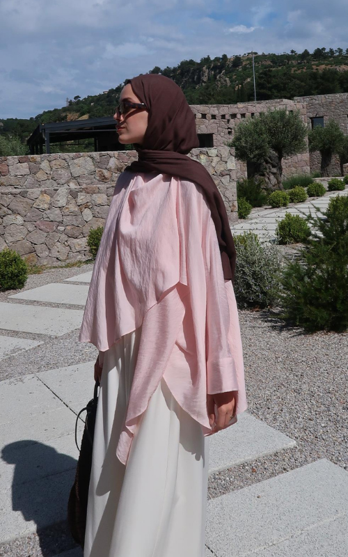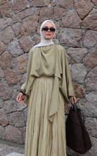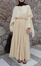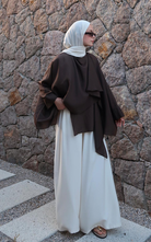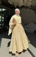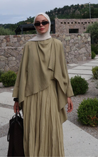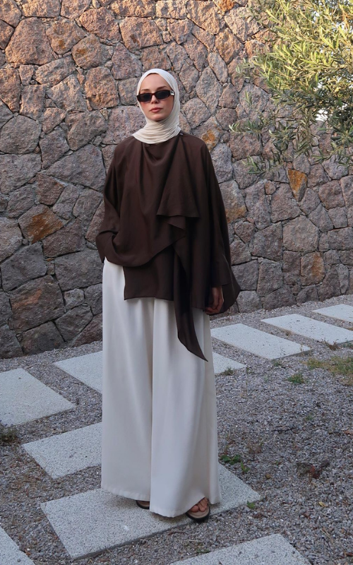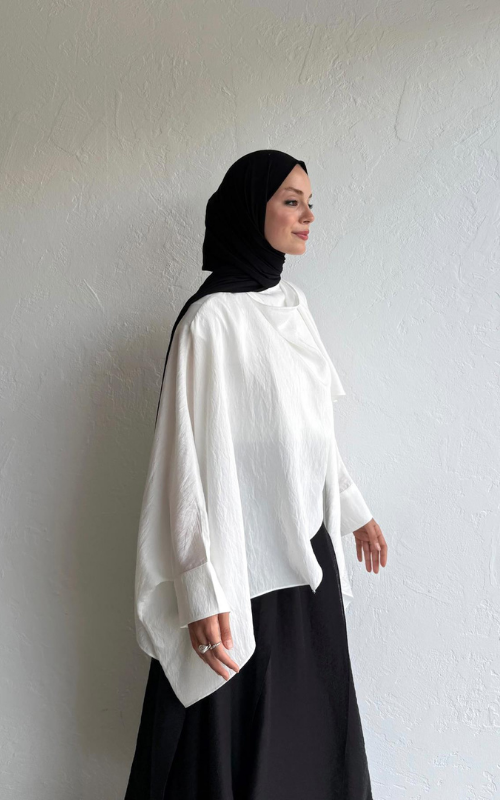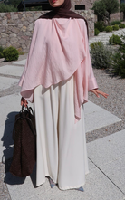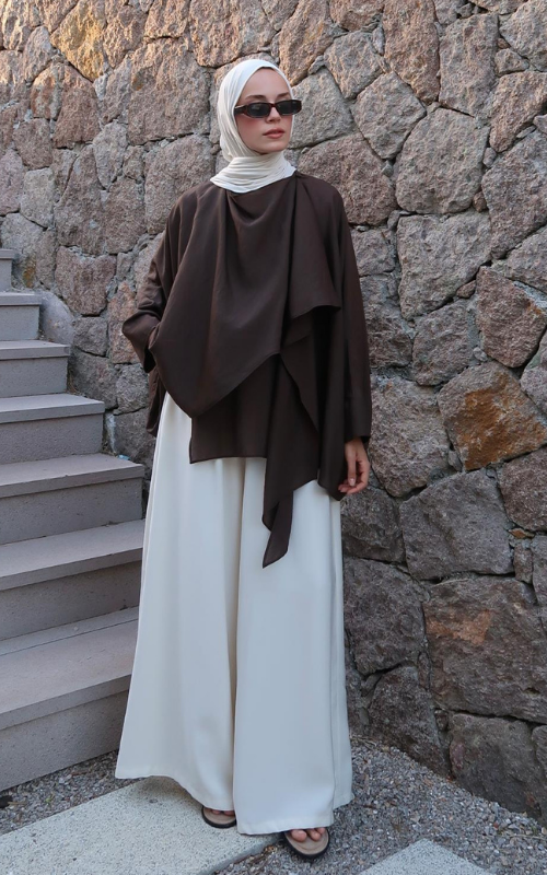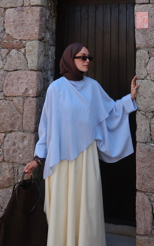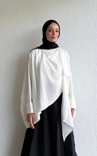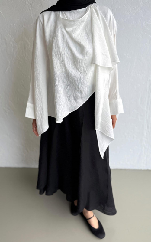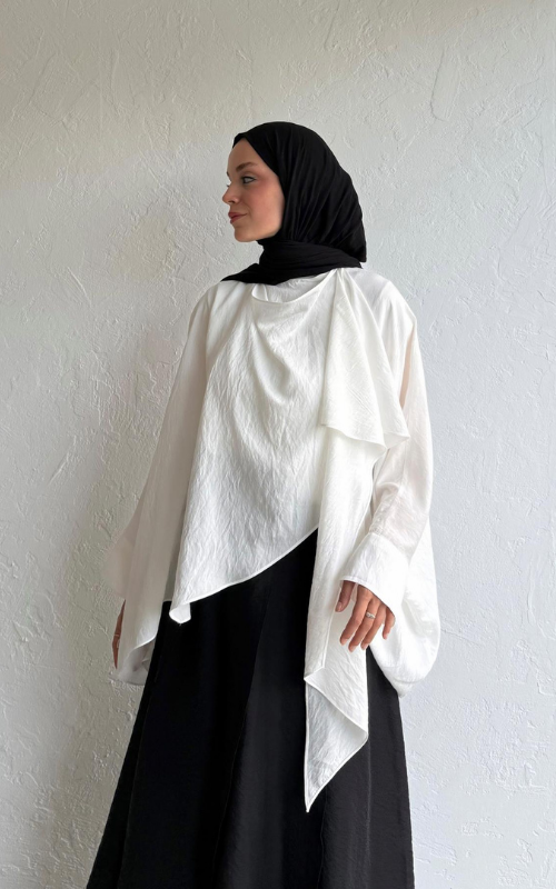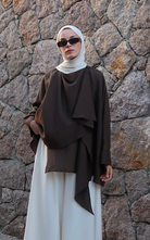 The Amal Top features a loose-fit, asymmetrical hemline. The neckline is round and gathered, one side of the chest has an overlapping fabric panel. The sleeves resembles a cape style.