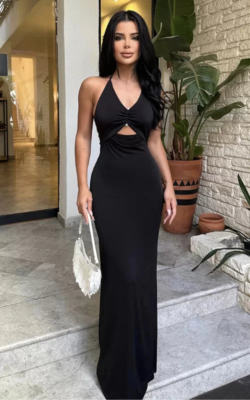 Dazzle in our Amour dress, its backless and halter design accentuates your grace while a bold cut-out element adds a hint of allure.