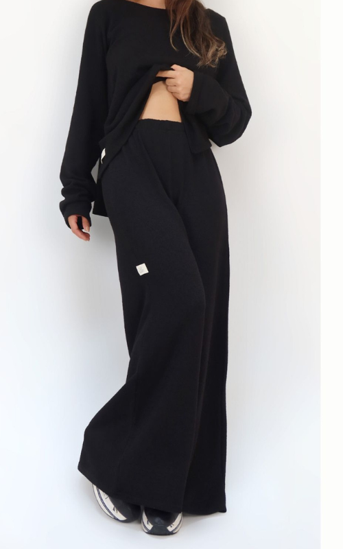 Black ribbed pants feature a thin elastic waistband and wide-leg silhouette for a relaxed yet refined look. The fabric contains organic cotton and elastane.